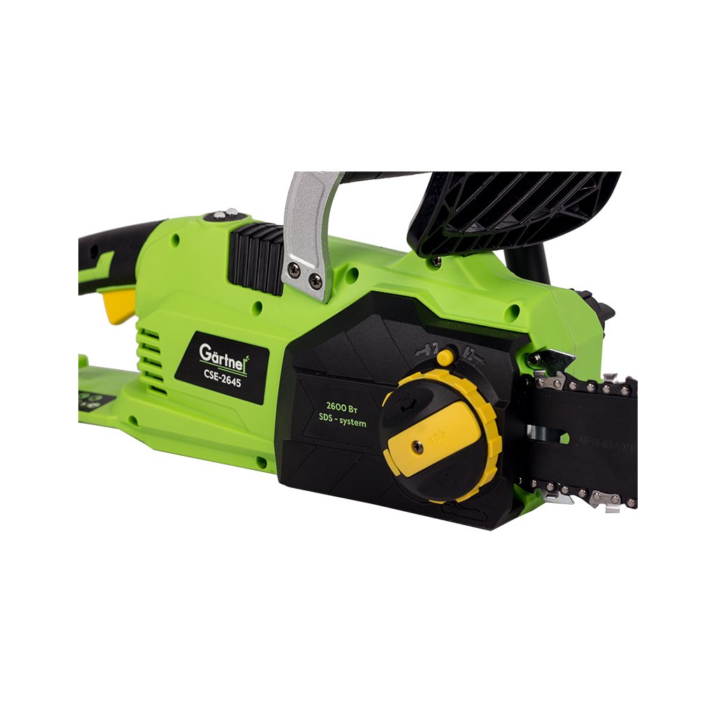 Gärtner CSE-2645 має ергономічний дизайн та обладнана системою безпеки, яка включає в себе захисний кожух та автоматичне гальмування ланцюга для безпечної та комфортної експлуатації.