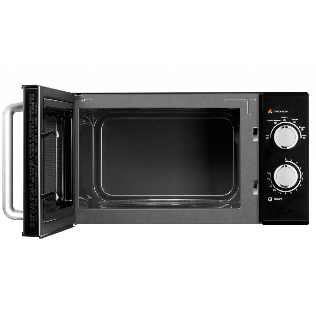 Мікрохвильова піч чорного кольору з механічним управлінням. Потужність – 900 Вт, є шість рівнів регулювання, а внутрішній обсяг дорівнює 23 л.